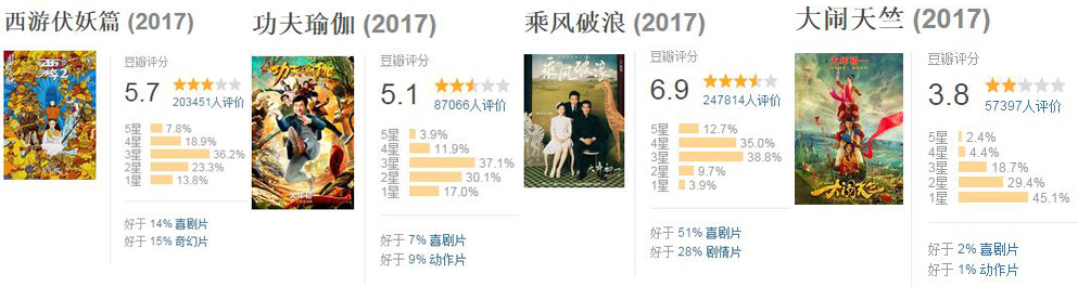 2016年的中國電影市場在眾多“聲音”和“現(xiàn)象”中結束,2017春節(jié)檔成為觀眾期待的電影盛宴,《西游伏妖篇》、《功夫瑜伽》、《大鬧天竺》、《乘風破浪》等影片吊足了觀眾胃口,但這聲勢浩大的表象背后卻依然是讓觀眾差強人意的質量。除《乘風破浪》后來居上實現(xiàn)口碑票房逆襲外,其余影片均沒有獲得觀眾好評,豆瓣評分均未過及格線,《大鬧天竺》更是只收獲3.8分;叵搿洞篝[天竺》深入三四線城市“60天50城”的賣力宣傳,隱約透出一絲尷尬的氣息。