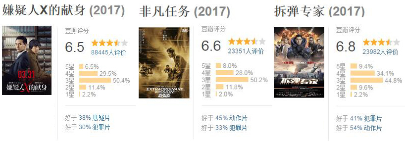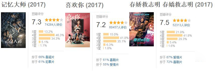 值得安慰的是國產(chǎn)電影并沒有表現(xiàn)出持續(xù)低迷的狀態(tài), 《嫌疑人X的獻身》6.5分、《拆彈專家》6.8分、《記憶大師》7.3分、《非凡任務》6.6分、《喜歡你》7.2分、《春嬌救志明》7.5分 ,影片評分走出低谷,收獲觀眾的認可。