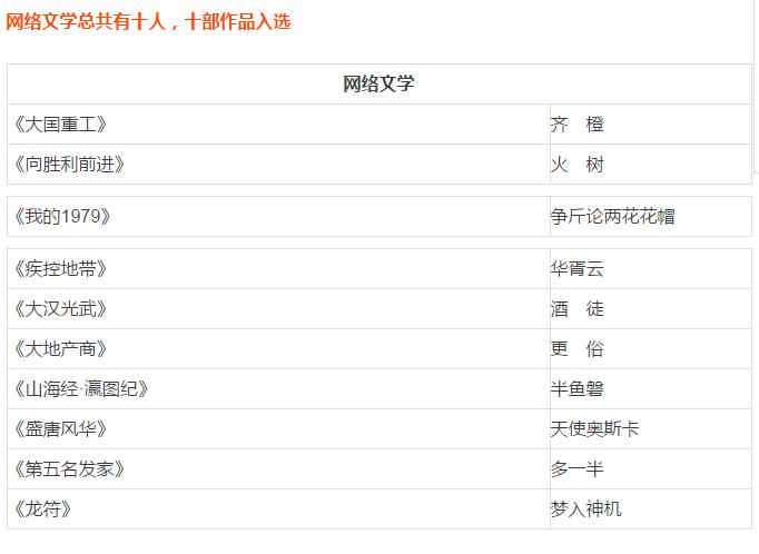 據(jù)中國作協(xié)官方公布的信息,2017年度重點作品扶持工作收到申報選題377項,經(jīng)專家論證和中國作家協(xié)會書記處審核,確定76項選題入選:長篇小說30項,報告文學、紀實文學20項,詩歌3項,散文7項,兒童文學4項,網(wǎng)絡文學10項。通過公布的重點作品名單可以看到,在網(wǎng)絡文學作品的創(chuàng)作選題評估上,注重支持反應現(xiàn)實生活、弘揚中國精神,書寫中國民族偉大復興中國的選題內(nèi)容。而更俗的《大地產(chǎn)商》則是一部以房地產(chǎn)行業(yè)為背景的商業(yè)勵志作品,而酒徒的《大漢光武》則是一部再現(xiàn)漢朝光輝歷史的鴻篇巨制。