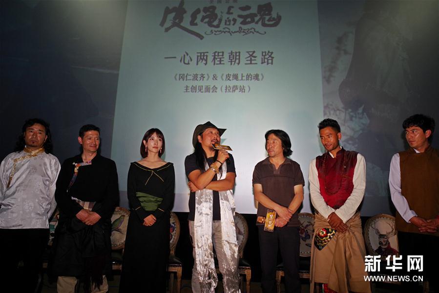 電影《皮繩上的魂》主創(chuàng)人員在拉薩首映式上與觀眾交流(7月24日攝)。 7月24日,西藏首部魔幻現(xiàn)實主義電影《皮繩上的魂》在拉薩舉行首映式。影片根據西藏作家扎西達娃的兩部短篇小說《西藏,系在皮繩結上的魂》和《去拉薩的路上》改編而成,由導演張楊執(zhí)導,扎西達娃編劇。新華社記者 劉東君 攝