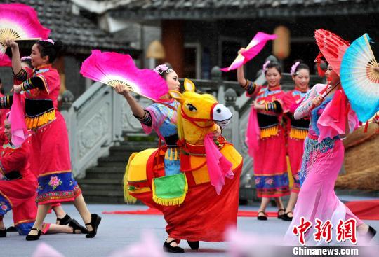 圖為鄉(xiāng)村春晚上表演的流行于閩西長(zhǎng)汀縣、有農(nóng)村生活寫(xiě)照特點(diǎn)和濃厚的鄉(xiāng)土氣息的民俗舞蹈《踩馬燈》!埍 攝