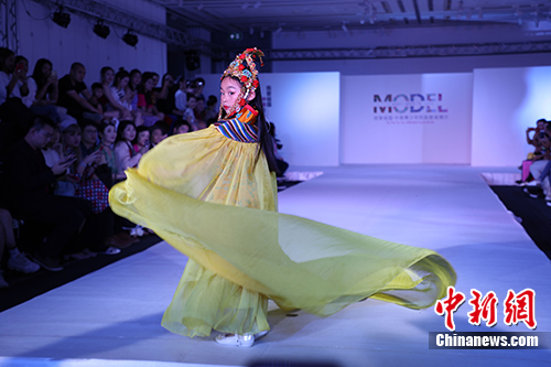 “青花瓷”系列展示首先登場。燈光下,舞臺四周一片青白。陸續(xù)走出的青少年“模特”們身著“青花瓷”色調(diào)的中國傳統(tǒng)服飾,散發(fā)出濃厚的東方韻味,令人驚艷。