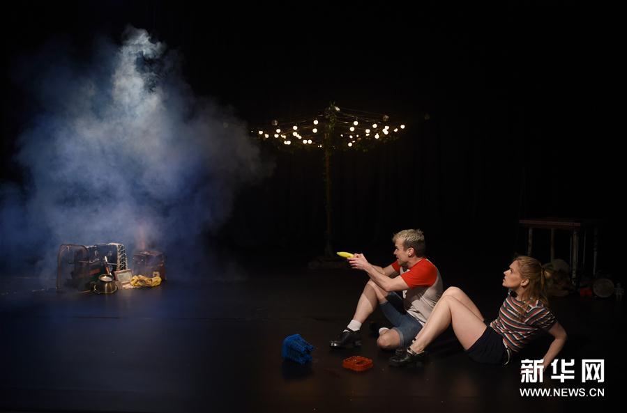 4月5日,演員蘇珊·克利里(右)與彼得·哈丁在表演中。當(dāng)日,愛爾蘭創(chuàng)意兒童舞劇《大浪之舞》亮相北京天橋藝術(shù)中心小不點(diǎn)大視界親子微劇場,曾在愛爾蘭踢踏舞劇《大河之舞》中出演的舞者蘇珊·克利里和彼得·哈丁聯(lián)袂登場,他們通過打擊樂、創(chuàng)意舞蹈、節(jié)拍游戲、講故事等形式,讓觀眾身臨其境感受“荒島求生”的故事。新華社記者 逯陽 攝 -