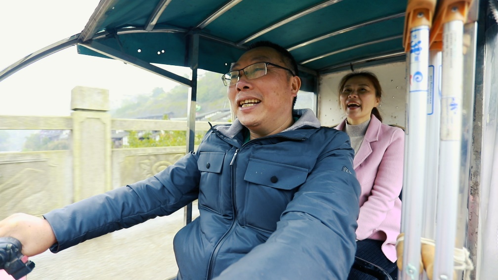 此前,外出打工的周開伍,最放心不下的就是丈夫的精神狀態(tài)!八诖采咸闪藘赡,不愿意出門。有一天他跟我說,夢(mèng)見自己買了一輛代步車,那感覺好自由啊像飛機(jī)一樣!焙髞(lái),周開伍到江津縣城,花5000多塊給他買了一輛代步三輪車。