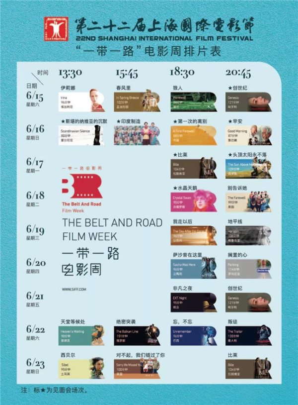 今年“一帶一路”電影周的活動包括:電影展映與見面會,“一帶一路”電影節(jié)聯(lián)盟新聞發(fā)布會,電影市場放映及買家沙龍,“一帶一路”電影周開幕電影,去哪兒拍?怎么拍?— 全球電影政策推介會,電影學(xué)堂,“一帶一路”電影文化圓桌論壇,“一帶一路”電影之夜等。
