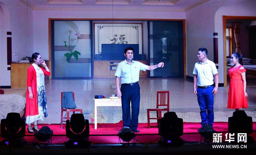9月7日晚,河南濮陽精準(zhǔn)扶貧文藝巡演活動走進(jìn)清豐縣馬村鄉(xiāng)白馬楊村,演員在表演四平調(diào)《不講排場又如何》。為充分發(fā)揮文藝作品在扶貧攻堅工作中的“扶志”和“扶智”作用,河南濮陽圍繞扶貧攻堅主題積極組織文藝創(chuàng)作,廣泛開展文藝宣傳活動。8月中旬至10月中旬,濮陽將在全市五縣一區(qū)開展文藝巡演活動100場次。新華社記者馮大鵬攝