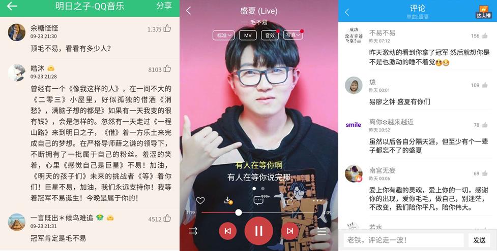 對于選手們精彩絕倫的表現(xiàn),網(wǎng)友們紛紛通過QQ音樂、酷狗音樂、酷我音樂應(yīng)援打氣,999+熱評歌曲不斷涌現(xiàn),熱評點贊數(shù)更是動輒破萬。最終,在人氣值比拼中,毛不易以微弱優(yōu)勢打敗馬伯騫,眾望所歸贏得《明日之子》最強廠牌殊榮,獲得白金唱片,奪冠曲《盛夏》更是力壓鹿晗和王俊凱、躥上QQ音樂巔峰榜流行指數(shù)榜首。從盛夏到初秋,在《明日之子》的未來偶像孵化過程中,騰訊音樂娛樂也充分玩轉(zhuǎn)“聽看唱玩”的“鵝式綜藝精神”,為粉絲們打造極具凝聚力的立體參與感。