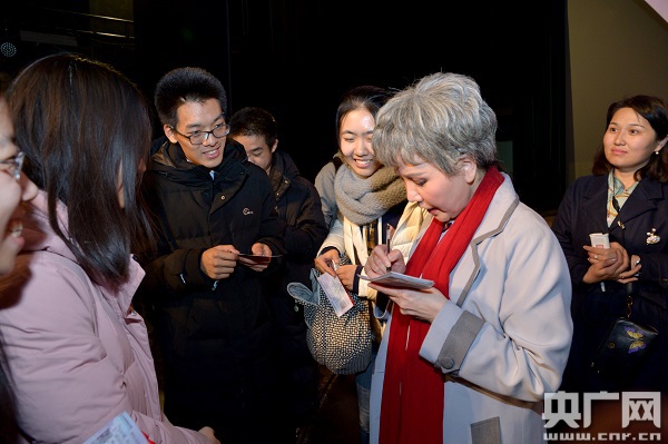 圖為著名滬劇表演藝術家茅善玉為青年學子簽名留念。(央廣網(wǎng)發(fā) 上海滬劇院供圖)