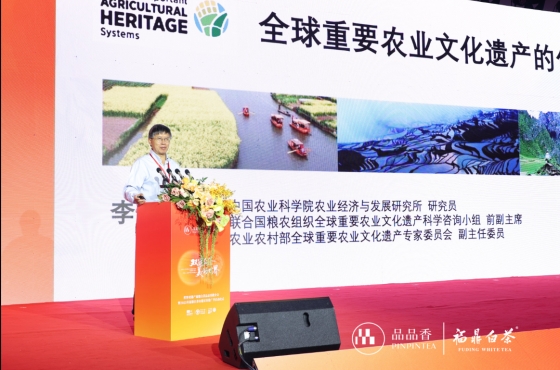 現(xiàn)場還延請兩位權(quán)威專家作專題分享。中國農(nóng)科院農(nóng)業(yè)經(jīng)濟與發(fā)展研究所研究員、聯(lián)合國糧農(nóng)組織全球重要農(nóng)業(yè)文化遺產(chǎn)科學咨詢小組前副主席李先德以《全球重要農(nóng)業(yè)文化遺產(chǎn)的傳承和發(fā)展》為題,結(jié)合全球農(nóng)遺標準與福鼎實踐,指出“福建福鼎白茶文化系統(tǒng)”的核心特征——提供食物營養(yǎng)與生計安全保障、擁有豐富的農(nóng)業(yè)生物多樣性、當?shù)貍鹘y(tǒng)知識與技術(shù)體系、極具地方特色的茶文化、多樣迷人的茶園景觀。同時提出保護端需守護茶樹種質(zhì)、傳統(tǒng)技藝與習俗;發(fā)展端要打造高端特色產(chǎn)品、探索茶文旅融合,并構(gòu)建“政府-企業(yè)-合作社-茶農(nóng)”多方利益共享機制,保障福鼎白茶可持續(xù)發(fā)展。