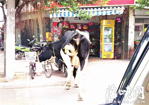 記者來到現(xiàn)場時,并沒有找到這頭奶牛。周邊的居民說,奶牛跑到哪里去了,他們也不清楚,可能是被主人牽走了。上午看到這頭奶牛時,它脖子上的繩子斷了,估計是附近有人養(yǎng)的,沒有拴好,奶牛掙脫繩子跑到了馬路上。奶?吹接腥嘶蚱噺呐赃吔(jīng)過時,沒有一點害怕的感覺。