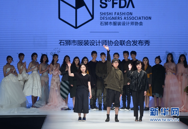 4月25日,在石獅國際時(shí)裝周上,蔡萍萍(前排左)和另外兩位年輕設(shè)計(jì)師在作品展出后謝幕。新華社記者 宋為偉攝 -