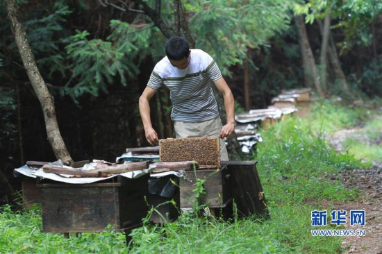 7月22日,陳村蜂農(nóng)在養(yǎng)蜂場(chǎng)進(jìn)行日常管理。新華社發(fā)(陳柏材 攝)