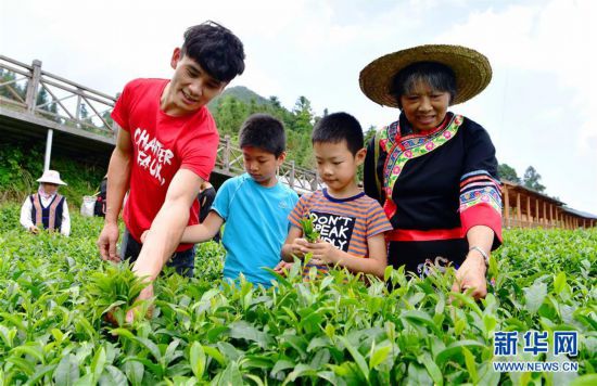 8月5日,游客在瑪坑鄉(xiāng)的生態(tài)觀光茶園里體驗采茶樂趣。