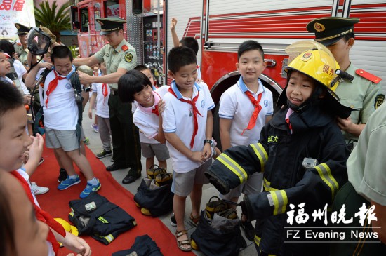 小學(xué)生體驗(yàn)穿戴消防服裝。
