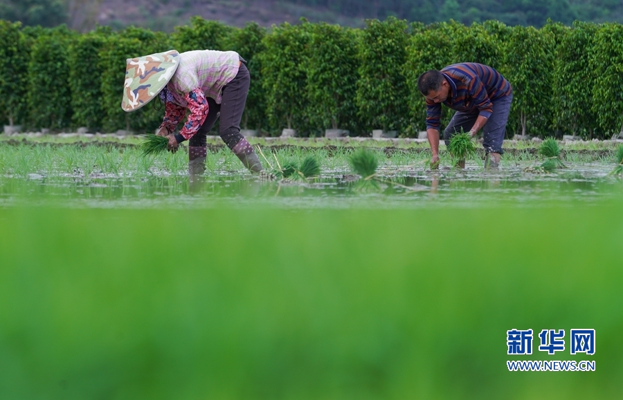 農戶正在田間拋秧。新華網 肖和勇 攝