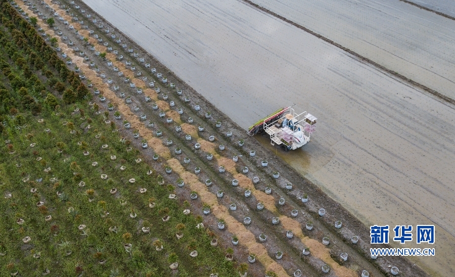 農戶駕駛插秧機在水田里插秧(無人機拍攝)。新華網 肖和勇 攝