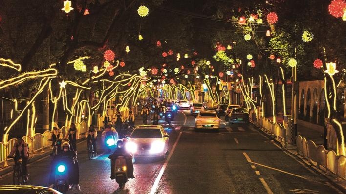 華燈初上,璀璨燈光點亮城市夜空,讓路人倍感溫馨,濃濃新春氛圍撲面而來。