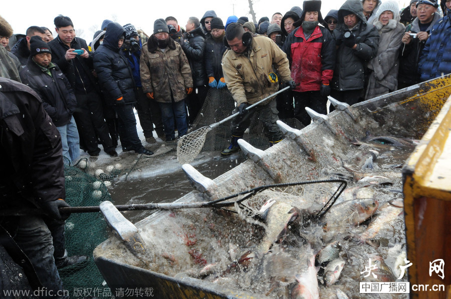 2014年12月28日,冰城哈爾濱市道里區(qū)首屆長(zhǎng)嶺湖冬捕冰釣旅游節(jié)在長(zhǎng)嶺湖國(guó)際冰釣場(chǎng)開(kāi)幕,在冬捕區(qū),500米長(zhǎng)的“拉網(wǎng)”在漁民和拖拉機(jī)的共同努力下被緩緩拉出冰面,圖為“拉網(wǎng)”拉出冰面,各種魚紛紛露出水面,將魚放入鏟車斗里。