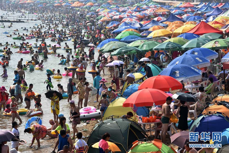 7月28日,游客在遼寧大連付家莊海濱浴場(chǎng)戲水消暑。
