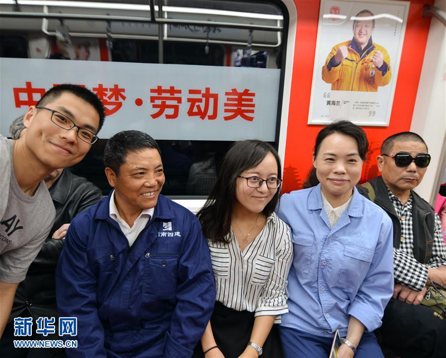 5月1日,全國(guó)勞模吳曉紅(右二)、劉志堂(左二)在“勞模地鐵專列”車廂內(nèi)與乘客合影。 “五一”勞動(dòng)節(jié)期間,一列“勞模地鐵專列”亮相長(zhǎng)沙地鐵1號(hào)線。該列車在車廂內(nèi)集中展示了由全國(guó)勞模、攝影家謝子龍拍攝的88位不同崗位全國(guó)勞模的肖像作品,旨在展示“勞動(dòng)最光榮、勞動(dòng)最崇高、勞動(dòng)最偉大、勞動(dòng)最美麗”的精神。新華社發(fā)(陳思維 攝) -