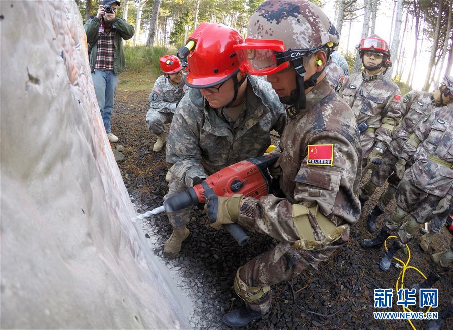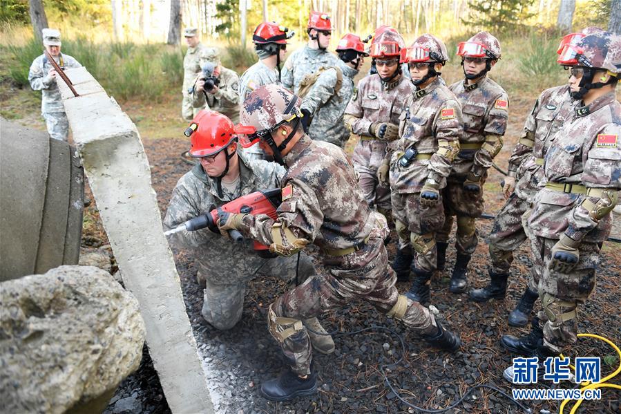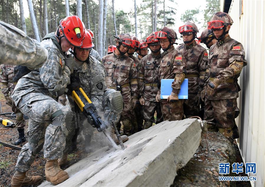 11月18日,在美國俄勒岡州錫賽德的國民警衛(wèi)隊拉里葉軍營,中方參演人員觀摩美方參演人員演練狹小空間救援。中美兩軍人道主義救援減災(zāi)聯(lián)合實兵演練當日進入第三天。此次聯(lián)合演練中美兩軍共派出200余人參加。新華社記者殷博古攝 -