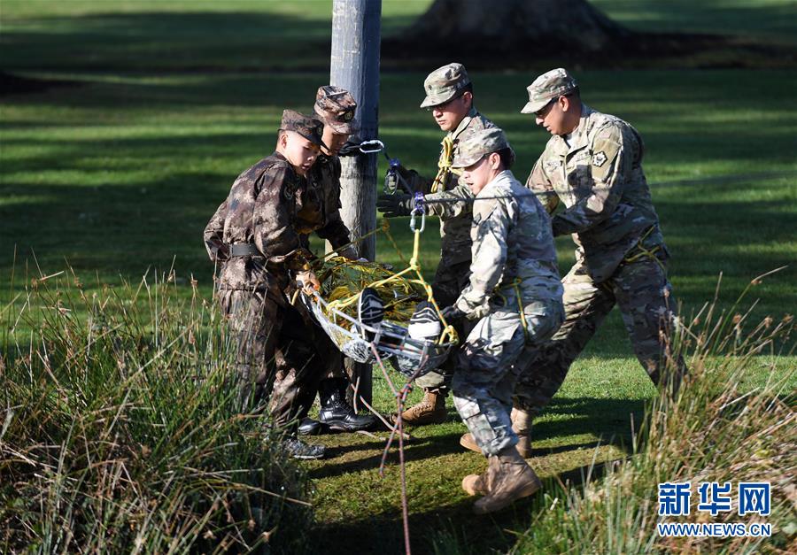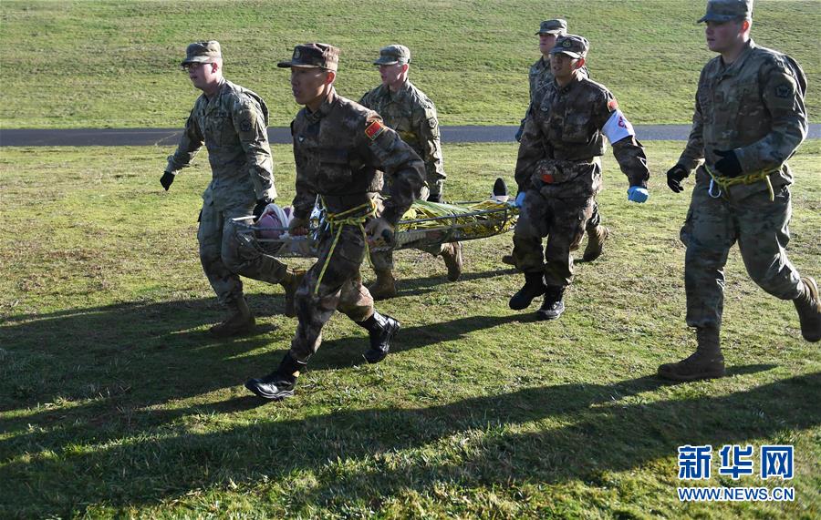 11月18日,在美國俄勒岡州錫賽德的國民警衛(wèi)隊拉里葉軍營,中美兩軍參演人員一同運送“傷員”。中美兩軍人道主義救援減災(zāi)聯(lián)合實兵演練當日進入第三天。此次聯(lián)合演練中美兩軍共派出200余人參加。新華社記者殷博古攝 -