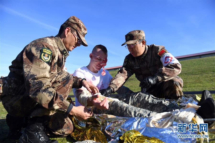 11月18日,在美國俄勒岡州錫賽德的國民警衛(wèi)隊拉里葉軍營,中美兩軍參演人員一同救治“傷員”。中美兩軍人道主義救援減災(zāi)聯(lián)合實兵演練當日進入第三天。此次聯(lián)合演練中美兩軍共派出200余人參加。新華社記者殷博古攝 -