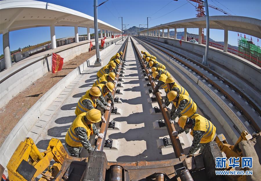中鐵十九局工程人員在京沈高鐵凌源南站進(jìn)行鋪軌作業(yè)(9月28日攝)。京沈高鐵起自北京星火站,經(jīng)河北省承德市、遼寧省朝陽(yáng)市、阜新市接入沈陽(yáng)站,線路全長(zhǎng)698公里,設(shè)計(jì)時(shí)速350公里。今年開(kāi)跑的“復(fù)興號(hào)”在京滬高鐵實(shí)現(xiàn)350公里時(shí)速運(yùn)營(yíng),再次創(chuàng)造了領(lǐng)先世界的中國(guó)速度。目前,中國(guó)鐵路在勘察設(shè)計(jì)、工程建造、高速動(dòng)車組、列車控制、牽引供電、運(yùn)營(yíng)管理、安全保障等領(lǐng)域已經(jīng)取得一系列自主創(chuàng)新成果,中國(guó)鐵路總體技術(shù)水平已邁入世界先進(jìn)行列,部分技術(shù)處于世界領(lǐng)先水平。作為中國(guó)“新四大發(fā)明”之一,高鐵不僅安全、便利、快捷地服務(wù)著中國(guó)旅客,同時(shí)也驚艷著世界。新華社記者 楊青 攝 -