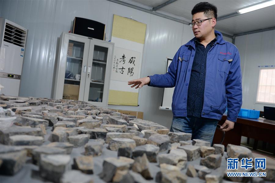陜西考古研究院助理研究員張楊力錚介紹秦咸陽城胡家溝建筑遺址出土的石磬(1月24日攝)。近日,考古工作者首次在秦咸陽城遺址區(qū)域內(nèi)發(fā)現(xiàn)秦代大型國家府庫遺存。這是繼20世紀(jì)70至80年代發(fā)掘秦咸陽宮遺址以來,在秦咸陽大遺址保護(hù)區(qū)內(nèi)再次發(fā)現(xiàn)秦代大型官署建筑遺址。此次發(fā)現(xiàn)的遺址位于陜西省西咸新區(qū)秦漢新城窯店鎮(zhèn),地處秦都咸陽城宮區(qū)以西的胡家溝塬地。遺址建筑四面為夯土垣墻,墻體厚度約3米,寬19.5米,總長110米。發(fā)掘過程中出土了數(shù)量眾多的石質(zhì)編磬殘塊,目前已在23件殘塊上發(fā)現(xiàn)了小篆“北宮樂府”等字樣,再次證實(shí)了秦代設(shè)樂府的史實(shí)。新華社記者 李一博 攝 -