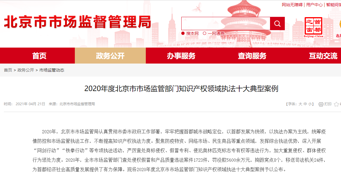 《2020年度北京市市場(chǎng)監(jiān)管部門知識(shí)產(chǎn)權(quán)領(lǐng)域執(zhí)法十大典型案例》如下: