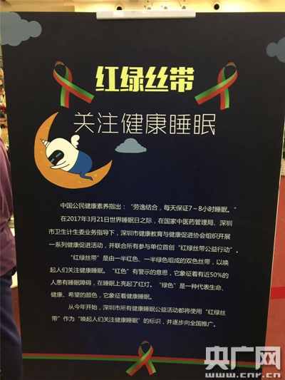 眾所周知,不同顏色的絲帶,被人們賦予了不同的特定含義。如紅絲帶是艾滋病病防治的標(biāo)識(shí);粉紅絲帶是乳癌防治的標(biāo)識(shí),綠絲帶是中國(guó)精神衛(wèi)生標(biāo)志,……而在世界睡眠日前夕,“紅綠絲帶”則成為獻(xiàn)給深圳市民的特別禮物——“關(guān)注健康睡眠”。