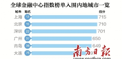 中國內(nèi)地有上海、北京、深圳、廣州、青島、大連六個城市進入榜單。其中,上海715分,全球排名第13,較上一期排名上升3位;深圳701分,全球排名第22,與上期保持不變;廣州首次進入全球金融中心指數(shù)體系,表現(xiàn)不俗,評分達到650分,全球排名第37;青島緊隨其后,評分達到649分,全球排名第38,較上期排名上升8位。