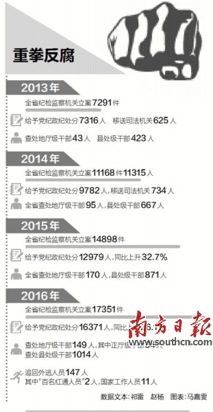據(jù)南方日?qǐng)?bào)報(bào)道:習(xí)近平總書(shū)記多次強(qiáng)調(diào)要以零容忍的態(tài)度懲治腐敗。黨的十八大以來(lái),廣東以前所未有的力度推進(jìn)全面從嚴(yán)治黨工作。全省紀(jì)檢監(jiān)察機(jī)關(guān)共立案51194件,超過(guò)前10年立案數(shù)總和;查處地廳級(jí)干部470人,是前10年的1.6倍,位居全國(guó)前列。廣東以前所未有的力度推進(jìn)全面從嚴(yán)治黨工作,為推進(jìn)全面建成小康社會(huì)、全面深化改革、全面依法治國(guó)提供政治保證。