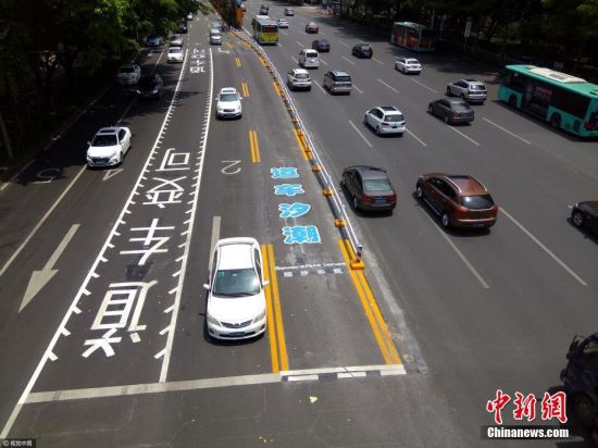 據中新網報道,4月17日,廣東深圳,全國首條應用遙控移動護欄燈控的潮汐車道亮相深圳市南山區(qū)深南南新路口。據介紹,遙控移動護欄的學名為“馬路機器人”,“馬路機器人”的應用讓潮汐車道和對向車道間有了物理隔離,這條潮汐車道也被形容為“會走路的潮汐車道”。鄒碧雄 攝 圖片來源:視覺中國