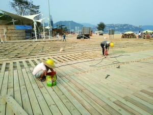 工人在大梅沙公園鋪設(shè)木質(zhì)地板。