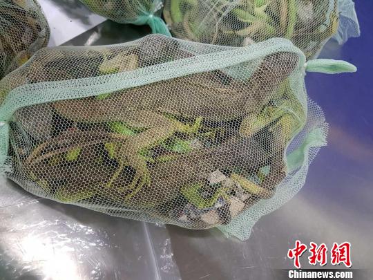 在當事人的背包中,關員發(fā)現(xiàn)了10個綠色的網兜,每一個網兜中都裝著10只左右的活體蜥蜴。