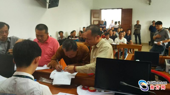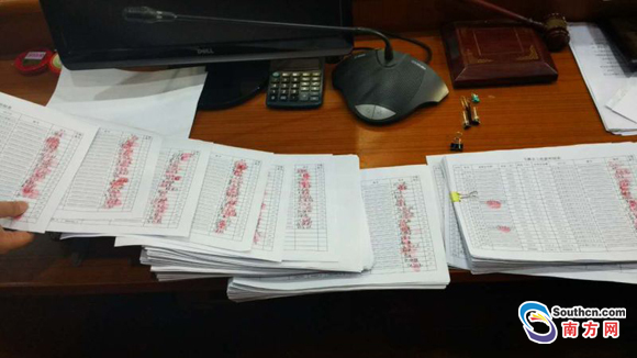 拿到補(bǔ)償款的工人們紛紛按下指模。(順德法院供圖)
