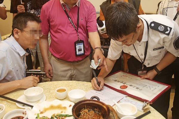 南方網(wǎng)訊 深圳5月份餐飲服務場所控煙執(zhí)法督查行動正式打響,羅湖區(qū)成為了此次控煙執(zhí)法督查的第一站。5月8日晚,執(zhí)法人員突擊檢查了羅湖區(qū)鳳凰路鳳山大廈附近餐飲服務場所。記者發(fā)現(xiàn),小餐館里違法吸煙的現(xiàn)象仍比較多,一些顧客面對突如其來的控煙檢查甚至惱羞成怒。檢查過程中,2家違反了《深圳經(jīng)濟特區(qū)控制吸煙條例》的經(jīng)營場所被警告處理,2名違法吸煙的市民被口頭教育并領取50元的罰單。