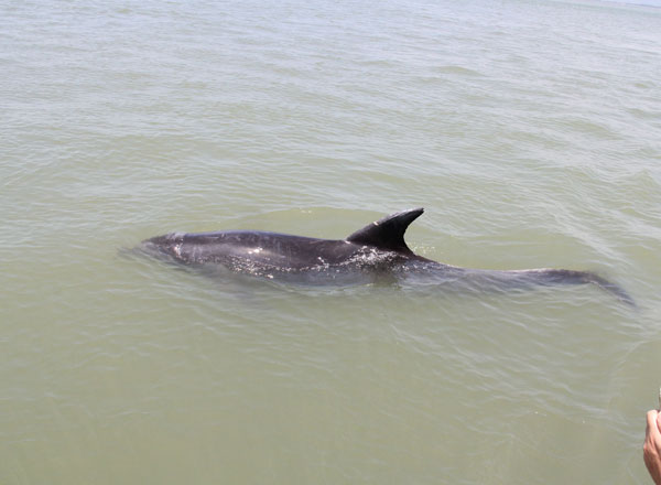 5月30日上午8時(shí)許,在海陵灣陽(yáng)江港附近海灘游玩的群眾看到海灘上有一只受困的黑色海豚,迅速報(bào)警求助。看到海豚身體露在水外,可能有生命危險(xiǎn),群眾一起將海豚往水里推了十幾米,但海豚仍不能游回大海,只能在近海淺水里慢速游動(dòng)。