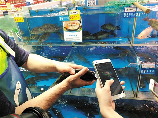 超市里的魚用手機(jī)掃碼可追溯產(chǎn)地信息 羊城晚報(bào)記者 陳澤云 攝