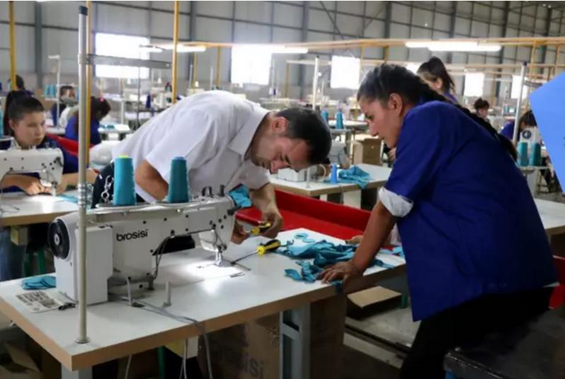 在伽師縣宇信服裝有限公司的工廠內,帶隊老師主動承擔起機器的維修工作,確保學生能夠正常工作。