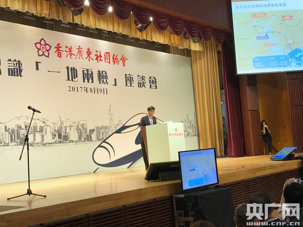 香港路政署鐵路拓展處副處長(zhǎng)陳彩偉在座談會(huì)一開(kāi)始講解“一地兩檢”方案。