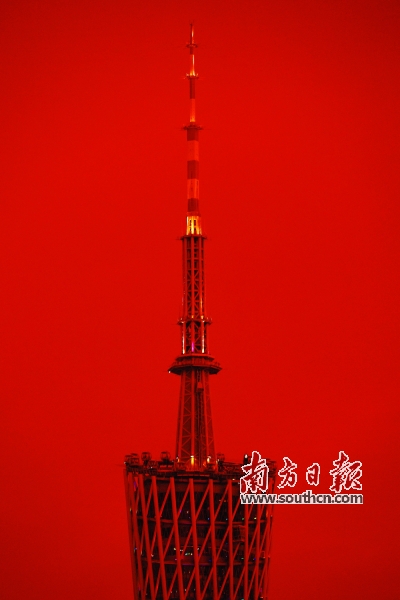 8月21日炎熱持續(xù),廣州落日紅透天,圖為“小蠻腰”在晚霞中。記者 王輝 攝