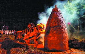 據(jù)介紹,今年的番塔高約4.68米,塔基直徑2.18米,由2400多塊新磚組成。砌番塔時很有講究,每一塊磚都是交錯相連。番塔每往上壘一層,就要往內(nèi)部收緊一圈,最上層頂端僅留一個直徑約20厘米的小孔。這樣類似“火山噴發(fā)”結(jié)構(gòu)的塔身,能夠讓火星和火苗在一瞬間就從頂端的小孔噴涌而出,最高可噴出2米。