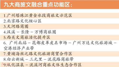 廣州市商務(wù)委副主任楊勇在論壇上首度公開了廣州市促進商旅文融合發(fā)展的戰(zhàn)略規(guī)劃,其透露廣州市將打造廣州商旅文融合發(fā)展九大功能區(qū),其中包括了廣州塔珠江黃金水段商旅文示范區(qū)、北京路文化核心區(qū)、天河路商圈、漢溪-長隆-萬博商旅圈、西關(guān)文商旅活化提升區(qū)、廣州北站-花都皮革皮具市場-廣州萬達文化旅游城-空港經(jīng)濟產(chǎn)業(yè)帶、黃埔海絲之路文化旅游商貿(mào)合作區(qū)、白云新城-三元里-流花路商旅帶、從化溫泉-流溪河商旅文體生態(tài)合作區(qū)。