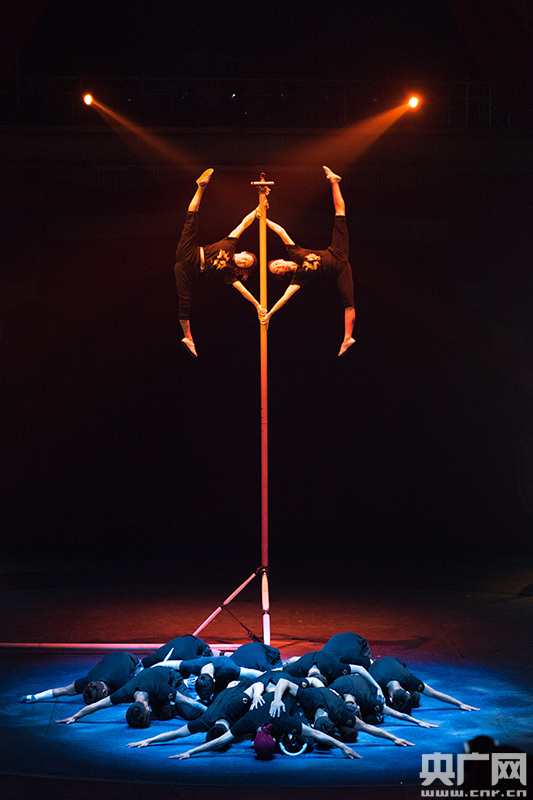 值得一提的是,節(jié)目中的道具由中國雜技團(tuán)總工程師王建民研究設(shè)計,在充分利用道具運動多樣化特點的基礎(chǔ)上,在傳統(tǒng)“爬桿”節(jié)目“攀爬”類動作中融入了以翻騰為主的跑酷技術(shù),以及力量、柔韌等多元技術(shù)動作,讓“桿”類節(jié)目實現(xiàn)了技術(shù)動作的脫胎換骨,不僅形成了與道具的有機互動,而且一改以男演員為主的傳統(tǒng),加入了女性在桿上表演的柔美技術(shù),成就了節(jié)目風(fēng)格的剛?cè)岵?/p>