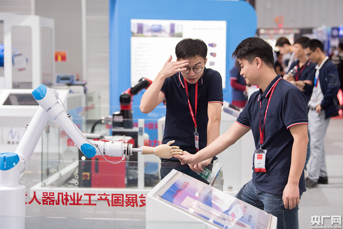 展館內(nèi)展示的可以與人握手的“機器人”。(央廣網(wǎng)記者 官文清 攝)