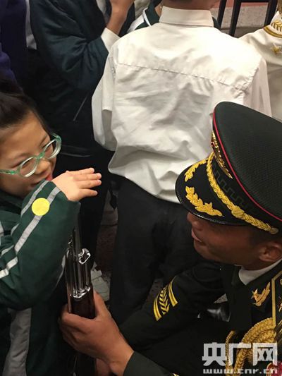 現(xiàn)場的互動可以看出,學(xué)生們對解放軍的一切都感到好奇,從服飾到日常生活,從身高到體重。其中不少學(xué)生跑到軍人面前比身高,幷和他們握手、擁抱。