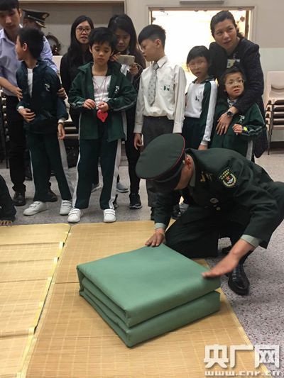 駐港部隊的戰(zhàn)士們向香港學(xué)生展示如何疊“豆腐塊兒”被子