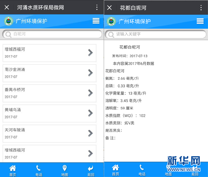 “廣州環(huán)保”微信公眾號每月公布廣州重點(diǎn)河流水質(zhì)情況,白坭河2017年6月仍為劣V類水質(zhì)。新華網(wǎng)記者盧鑒 攝